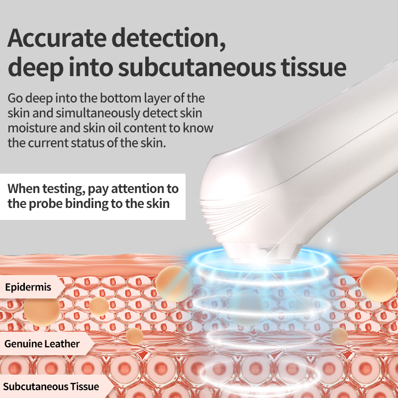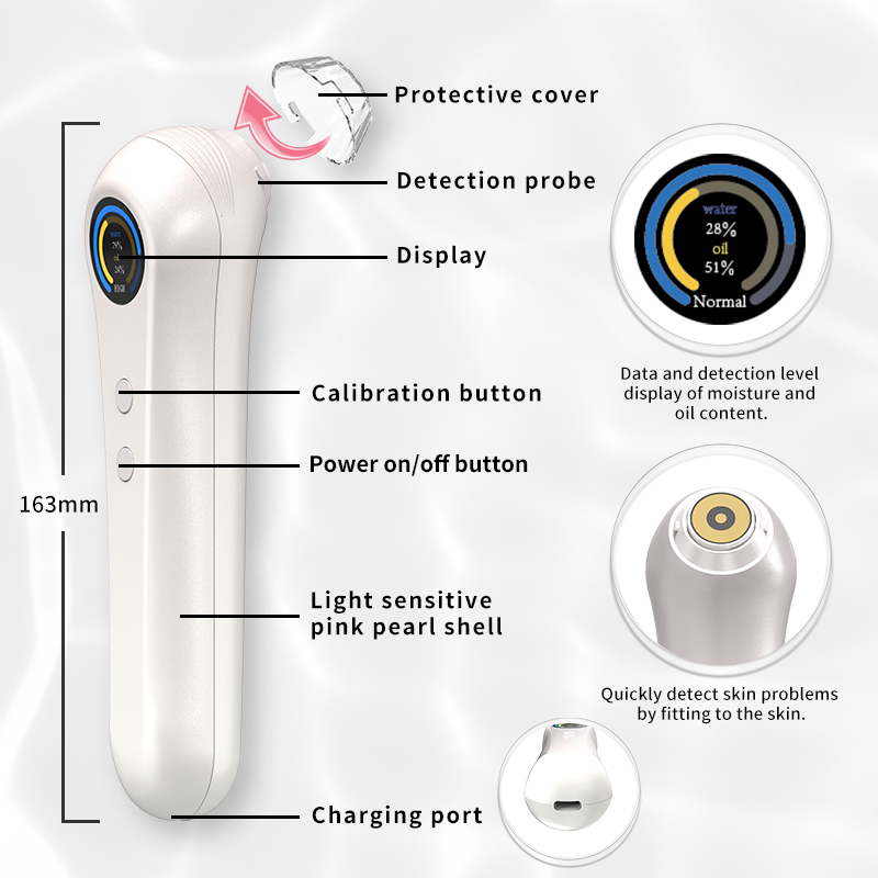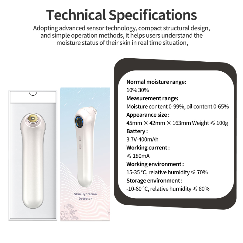 This portable personal skin moisture meter is designed for quick and accurate measurement of skin hydration levels. Utilizing advanced sensor technology, it helps users monitor their skin's moisture status in real-time, allowing for optimized skincare routines and promoting healthy, smooth skin. Its compact and lightweight design makes it perfect for home use, travel, and daily application.