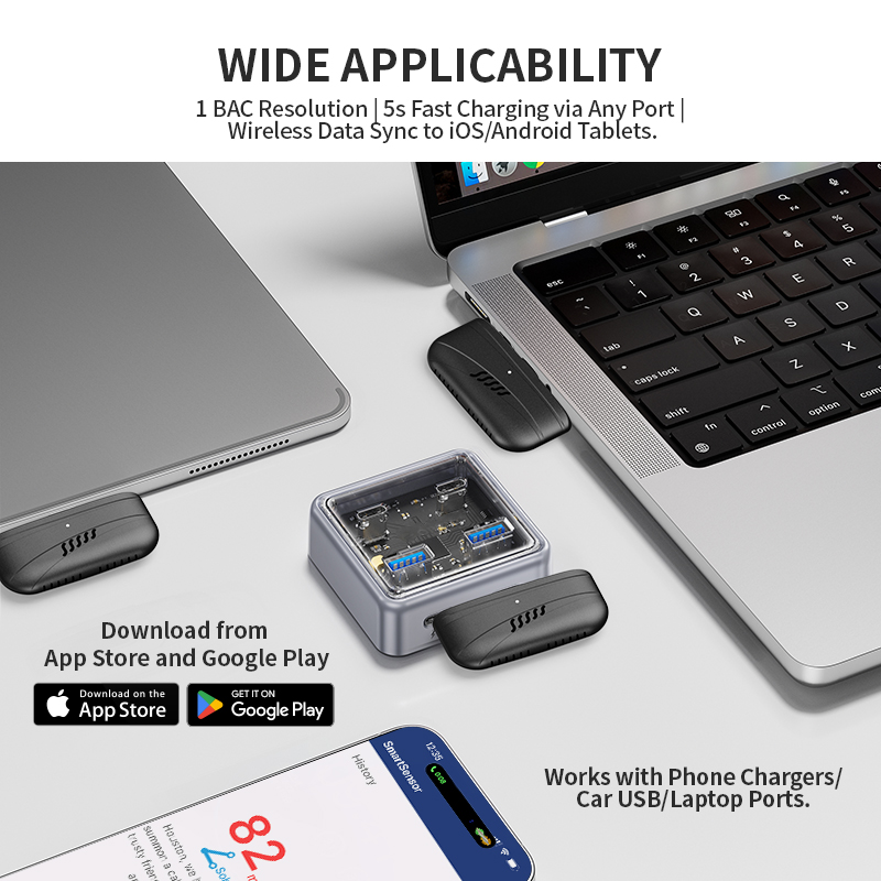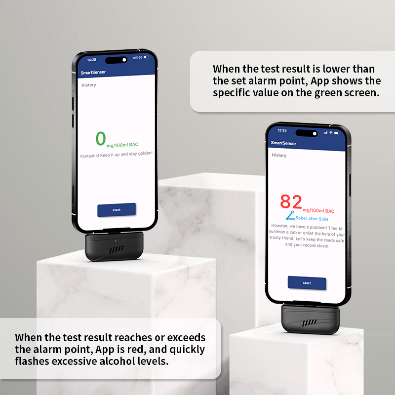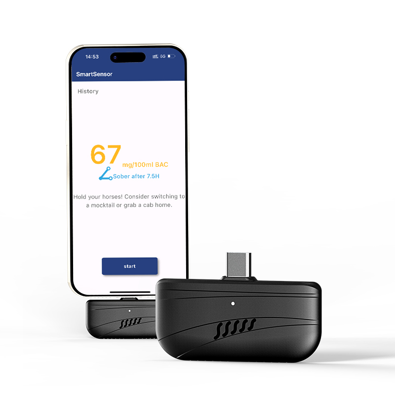Equipped with our latest intelligent sensors and intelligent algorithms, this device swiftly and accurately detects alcoho in breath with pinpoint precision.It operates seamlessly on data your phone's battery,displaying comprehensive through the app.With an extended battery life, sleek ano