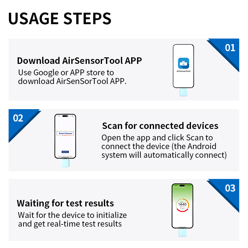 This cutting-edge gadget employs our proud solid-state fuel cell sensors,forged through years of hardcore research and development in industrial technology. lt harnesses the latest toxic gas data model for precise and swift detection of harmful CO2 gases.With the convenience of mobile phone power,a sleek app display, marathon battery life, and a stylish appearance - all packed into a neat, lightweight, and pocket-friendly design - it's the perfect companion for staying ahead in safety.